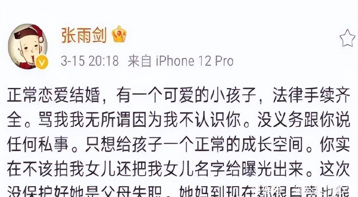 此事曝光后,大家才了解到张雨剑早已成家,其妻子正是吴倩。3月15日,张雨剑在个人账号上公开自己已结婚生子的情况。
